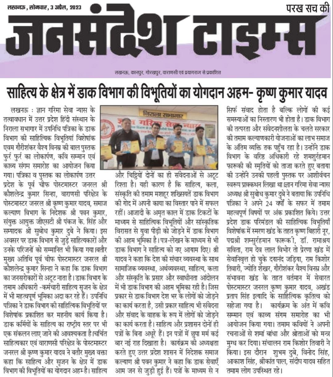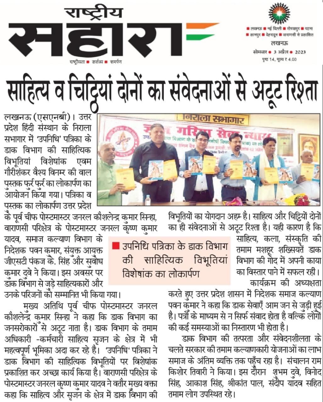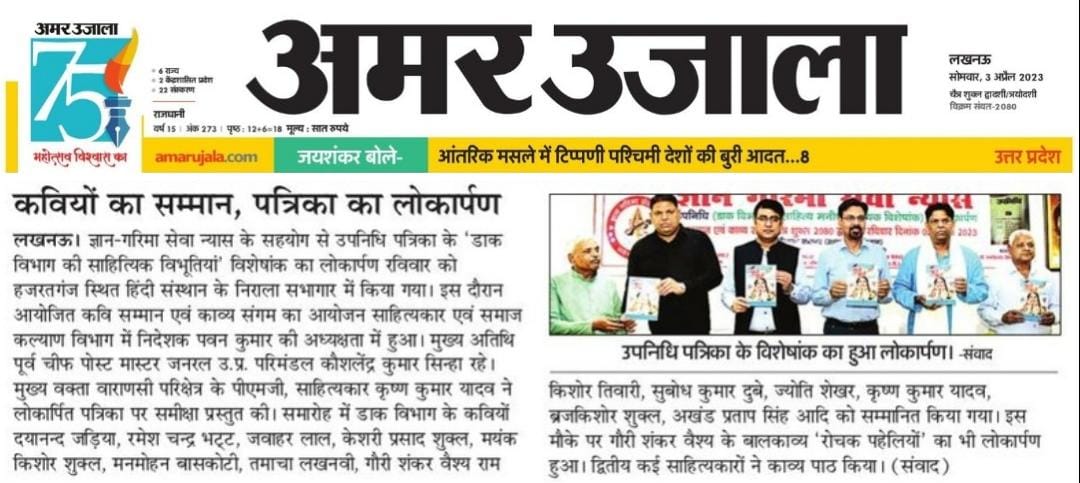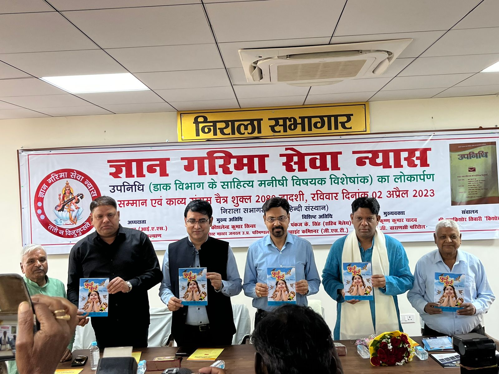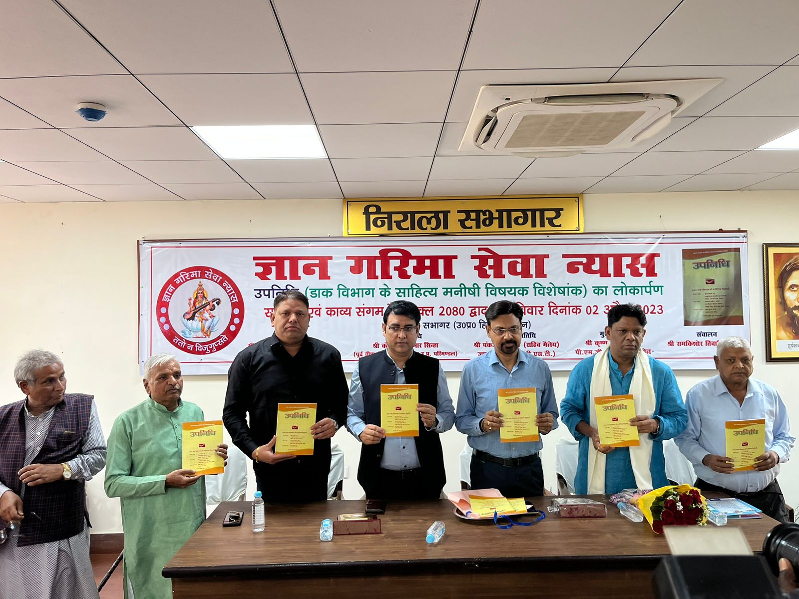 लखनऊ। ज्ञान गरिमा सेवा न्यास के तत्वावधान में उत्तर प्रदेश हिंदी संस्थान के निराला सभागार में ‘उपनिधि’ पत्रिका के डाक विभाग की साहित्यिक विभूतियां विशेषांक एवं गौरीशंकर वैश्य विनम्र की बाल पुस्तक “फुर्र फुर्र” का लोकार्पण, कवि सम्मान एवं काव्य संगम समारोह का आयोजन किया गया। पत्रिका व पुस्तक का लोकार्पण उत्तर प्रदेश के पूर्व चीफ पोस्टमास्टर जनरल कौशलेन्द्र कुमार सिन्हा, वाराणसी परिक्षेत्र के पोस्टमास्टर जनरल कृष्ण कुमार यादव, समाज कल्याण विभाग के निदेशक पवन कुमार, संयुक्त आयुक्त जीएसटी पंकज के. सिंह और सम्पादक सुबोध कुमार दुबे ने किया। इस अवसर पर डाक विभाग से जुड़े साहित्यकारों और उनके परिजनों को सम्मानित भी किया गया।