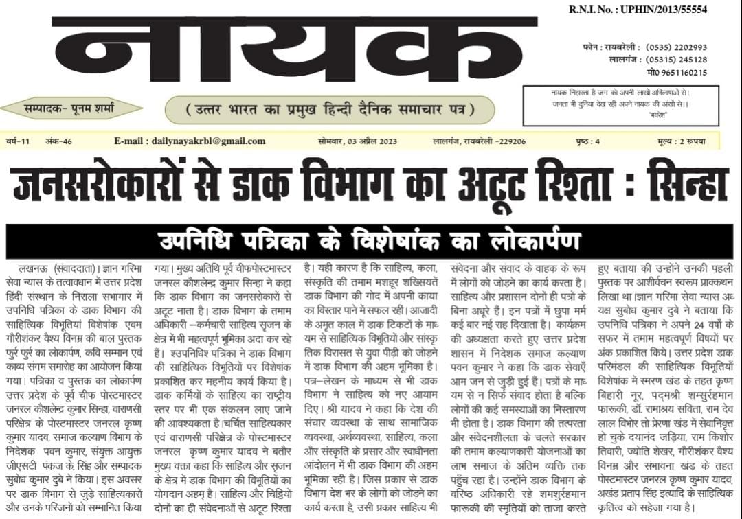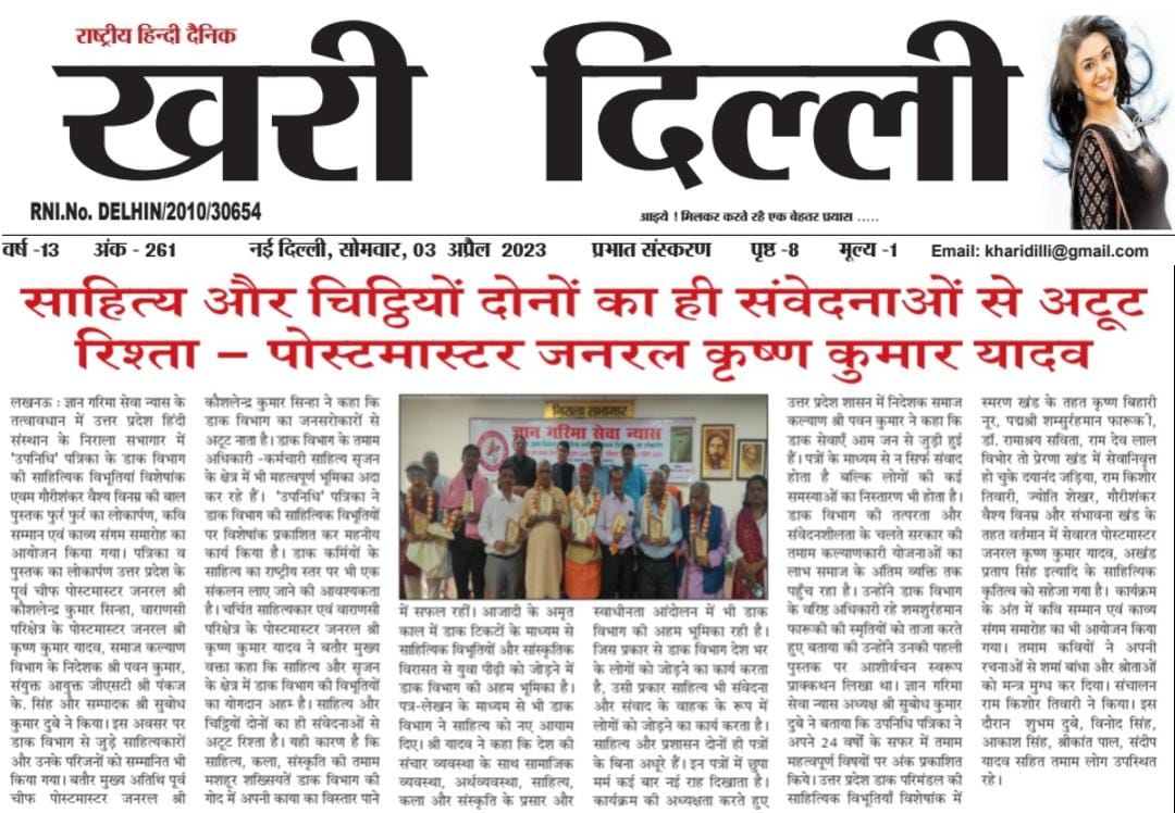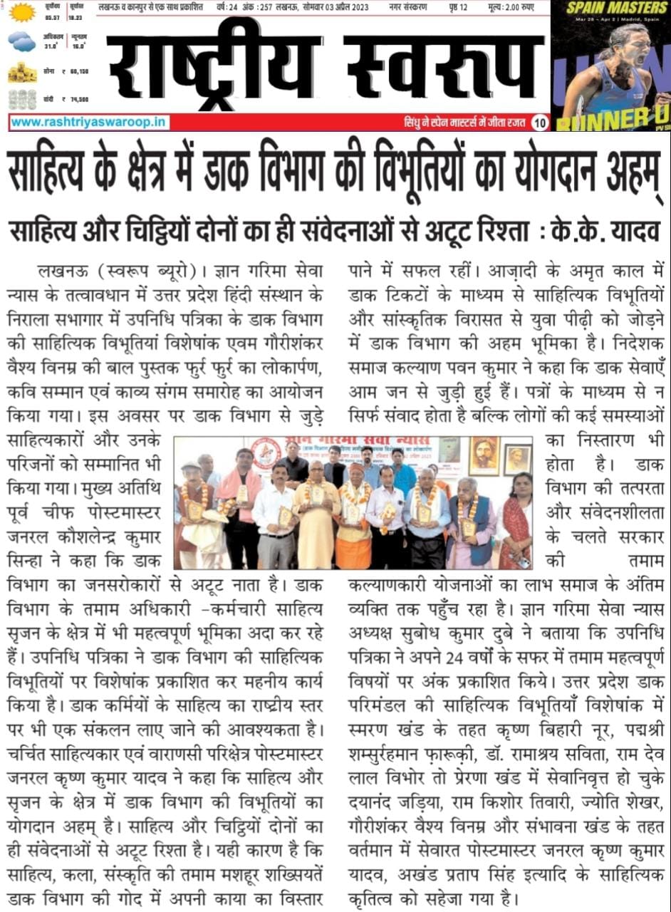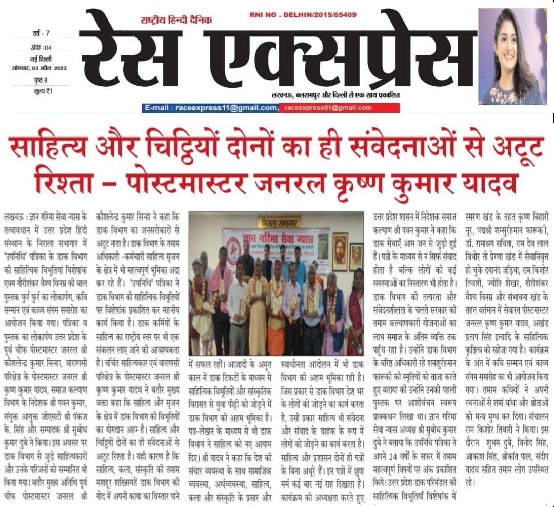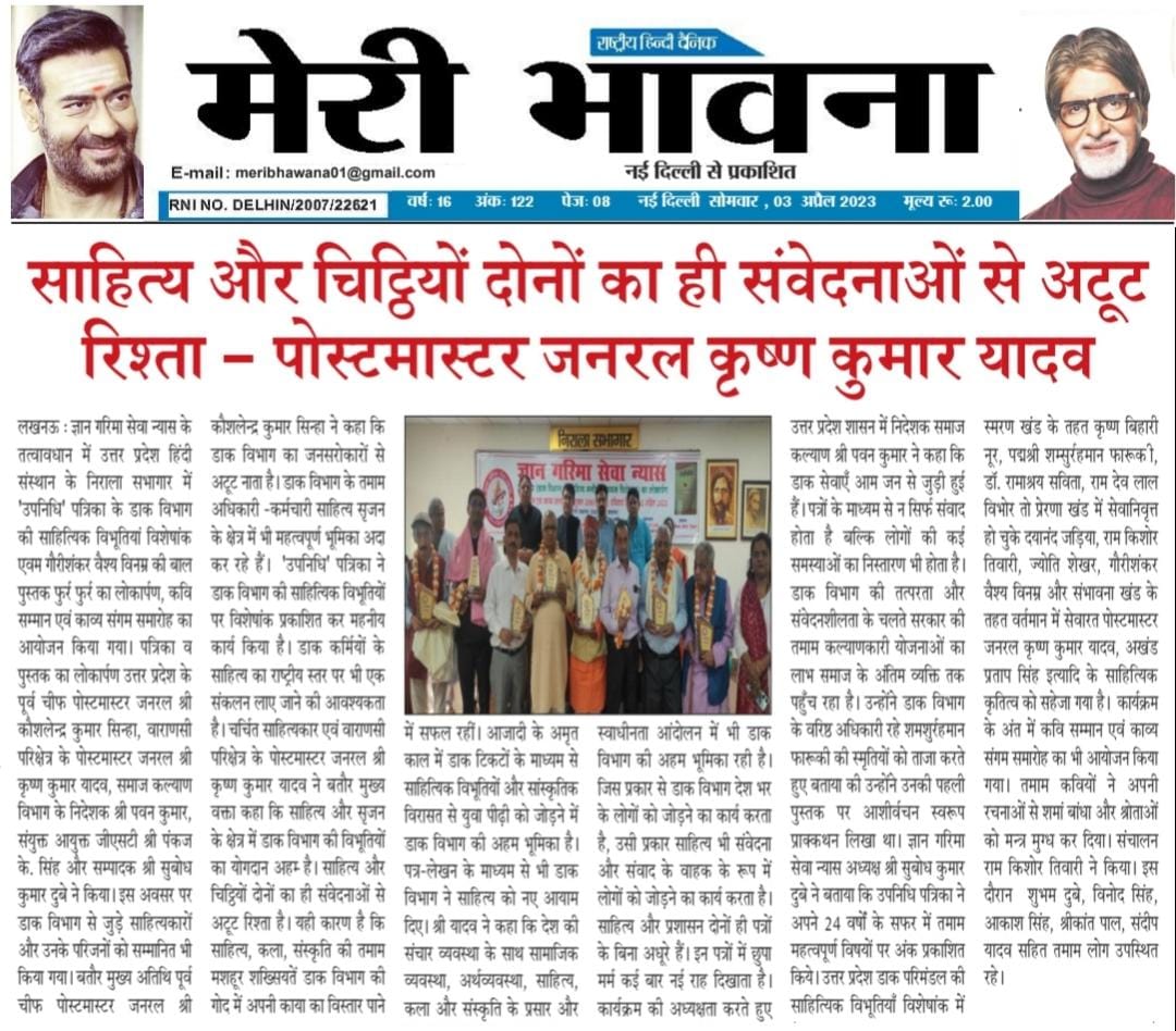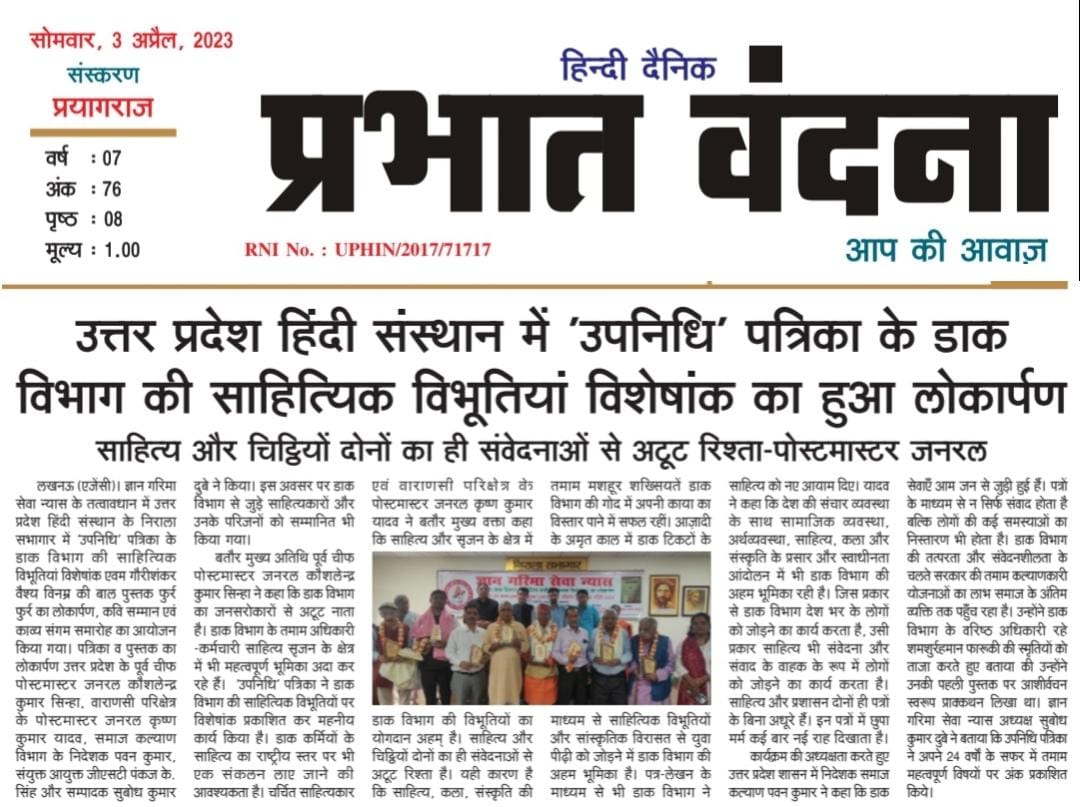 लखनऊ। ज्ञान गरिमा सेवा न्यास के तत्वावधान में उत्तर प्रदेश हिंदी संस्थान के निराला सभागार में ‘उपनिधि’ पत्रिका के डाक विभाग की साहित्यिक विभूतियां विशेषांक एवं गौरीशंकर वैश्य विनम्र की बाल पुस्तक “फुर्र फुर्र” का लोकार्पण, कवि सम्मान एवं काव्य संगम समारोह का आयोजन किया गया। पत्रिका व पुस्तक का लोकार्पण उत्तर प्रदेश के पूर्व चीफ पोस्टमास्टर जनरल कौशलेन्द्र कुमार सिन्हा, वाराणसी परिक्षेत्र के पोस्टमास्टर जनरल कृष्ण कुमार यादव, समाज कल्याण विभाग के निदेशक पवन कुमार, संयुक्त आयुक्त जीएसटी पंकज के. सिंह और सम्पादक सुबोध कुमार दुबे ने किया। इस अवसर पर डाक विभाग से जुड़े साहित्यकारों और उनके परिजनों को सम्मानित भी किया गया।